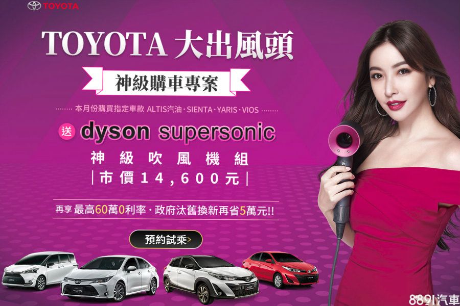 Toyota本月再推「大出風頭‧dyson神級購車專案」,凡購入Altis汽油版、Sienta、Vios以及Yaris等任一指定車型,即贈市價1.46萬元的dyson吹風機組之兌換憑證乙張,最高還有60萬0利率。