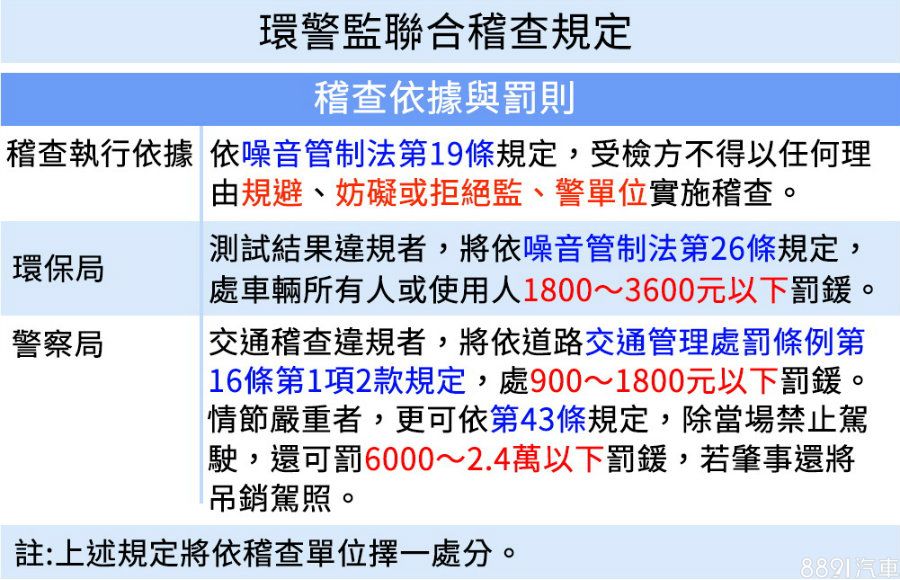 若檢舉複查結果不合格,環保局可依「噪音管制法第26條」規定,處以1800~3600元罰緩,警政機關稽查則會依「道路交通管理處罰條例第16條1項2款」規定,處以900~1800元罰緩,更甚者(如拔除排氣管)更可依第43條規定,除當場禁止駕駛,更會處6000元~2.4萬元罰緩,若因此肇事還會吊銷駕照。