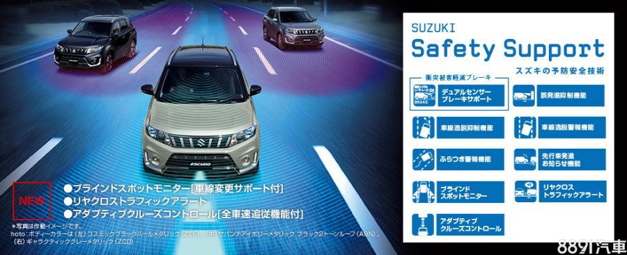 原廠早先就曾透露「新科技」將會隨小改款Vitara一同登台,不排除為主動安全系統Suzuki Safety Support,整合了盲點偵測、後方交通警示、附主動煞停的ACC主動式巡航、車道偏離警示與輔助、前車離開提醒、油門誤觸抑止、自動緊急剎車輔助等系統,但是否為完整導入尚未可知。