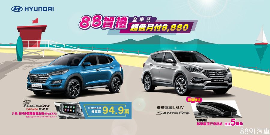 當然,若你考慮坐擁Tucson、Santa Fe等指定車款,前者祭出限時優惠價94.9萬,還再升級8吋多媒體系統,後者Santa Fe則贈送限量THULE車頂行李箱,價值5萬元。