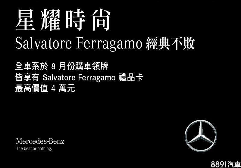 台灣賓士8月特別推出專屬優惠,凡在8月底購車並完成領牌,即可享有「星耀時尚專案」,其中購入18/19年式(含)之前車型,官方將贈送面額4萬元的Salvatore Ferragamo 專屬禮品卡,若選擇入主19/19年式車型,也能獲贈面額2萬元的專屬禮品卡。