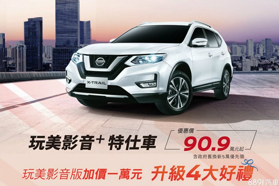 除Tiida之外,Nissan也推出「X-Trail玩美影音+特仕車」,經舊換新補助後,新車優惠價只要90.9萬起,若玩美影音版加價1萬元,還可升級全景天窗、LED頭燈、18吋鋁圈以及大馬力引擎等4大好禮。