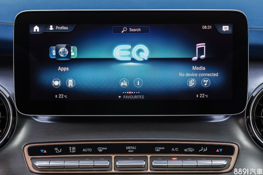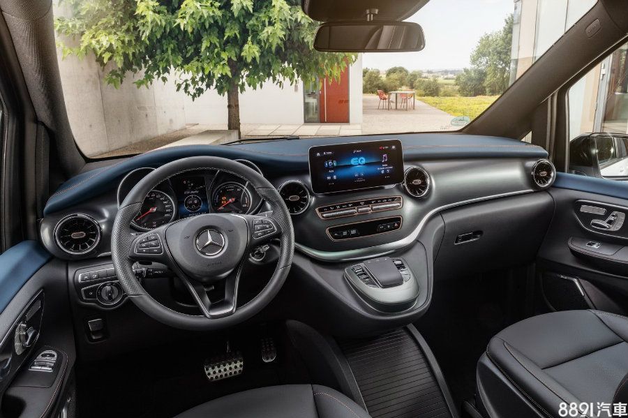車室鋪陳同樣大致維持現行V-Class格局,但透過藍色元素和玫瑰金金屬材質的應用,呼應電氣化與增添質感呈現。