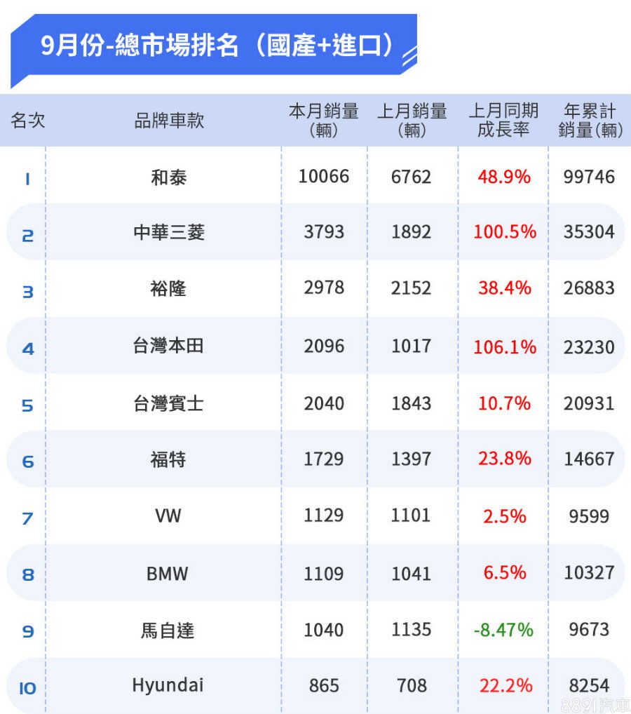 由於民俗月的結束,國內車市也普遍回溫,綜觀市場成長翻倍者更是不在少數。9月總市場銷量相較於前一月份成長37.1%,且與去年同期相比亦有6.7%之漲幅。