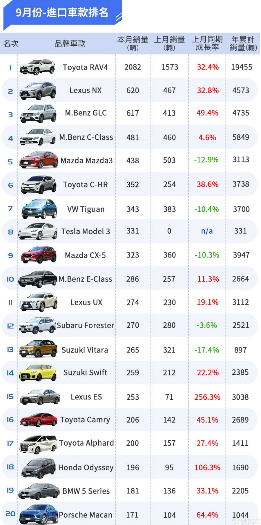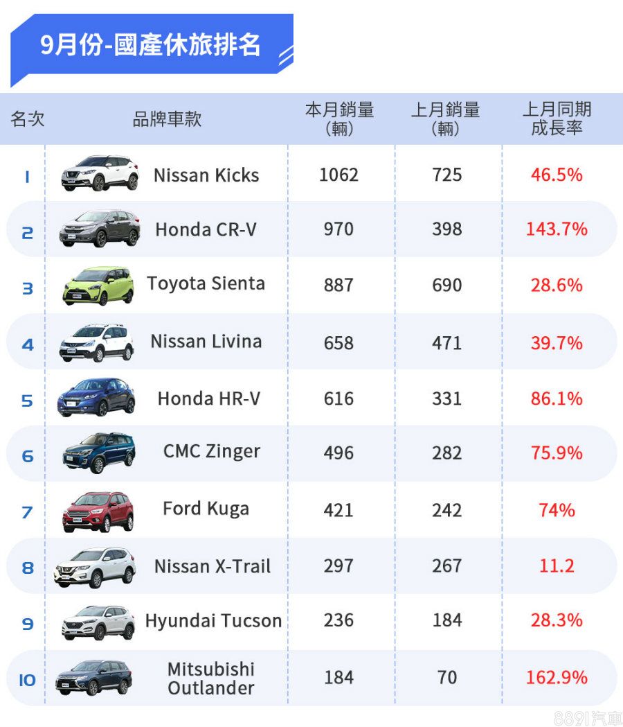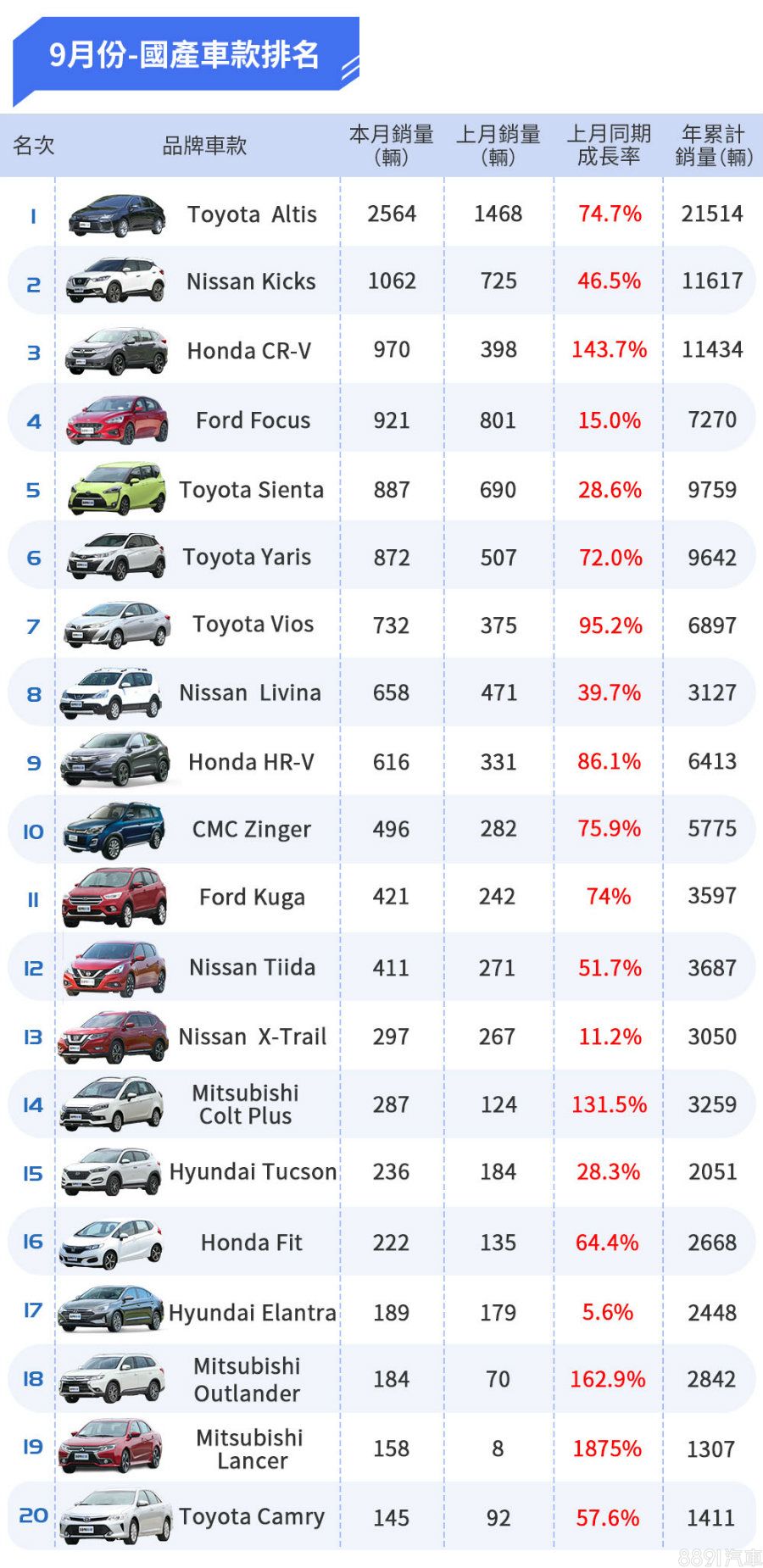9月入榜的前20名國產車款,全數繳出銷量上漲的「滿江紅」,且許多車款更有著雙位數、甚至於三位數的百分比。