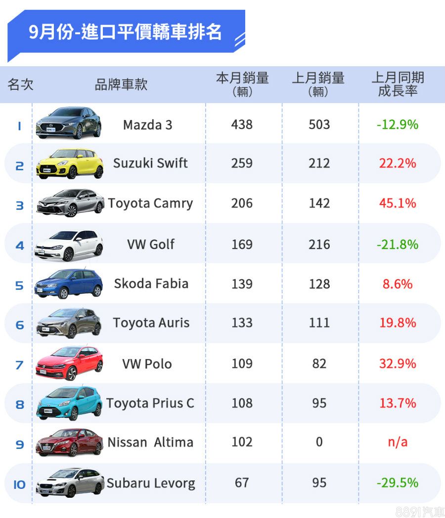 隨著典型轎車不再主流,相對於其他級距市場,進口平價轎車的漲跌反而略趨平淡了點。在該級距市場上一枝獨秀的Mazda3,雖說於9月迎來12.9%的跌幅,不過仍以四百餘輛的成績穩居首位。