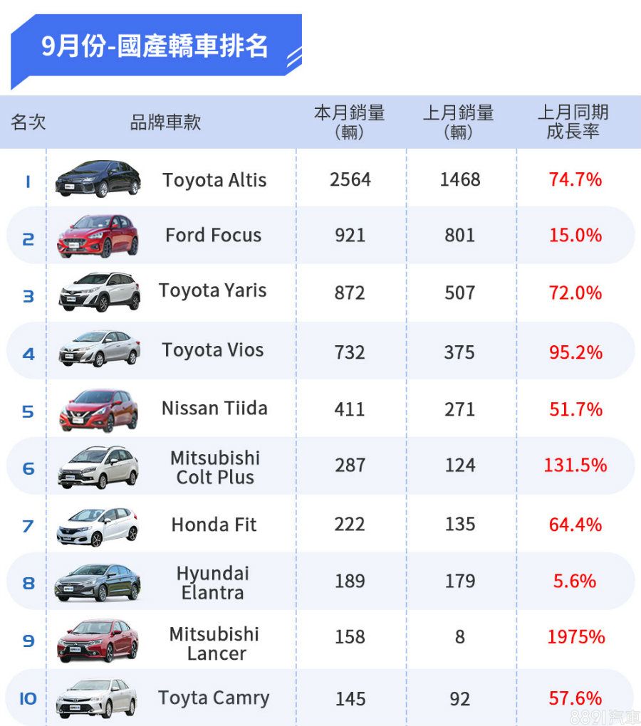 Mitsubishi於9月成長顯著,甫於8月初上架的新年式Lancer也終於在本月開始繳出成績,Outlander及Colt Plus亦分別陣勢支援,讓三車同時登上國產熱銷20名榜單。