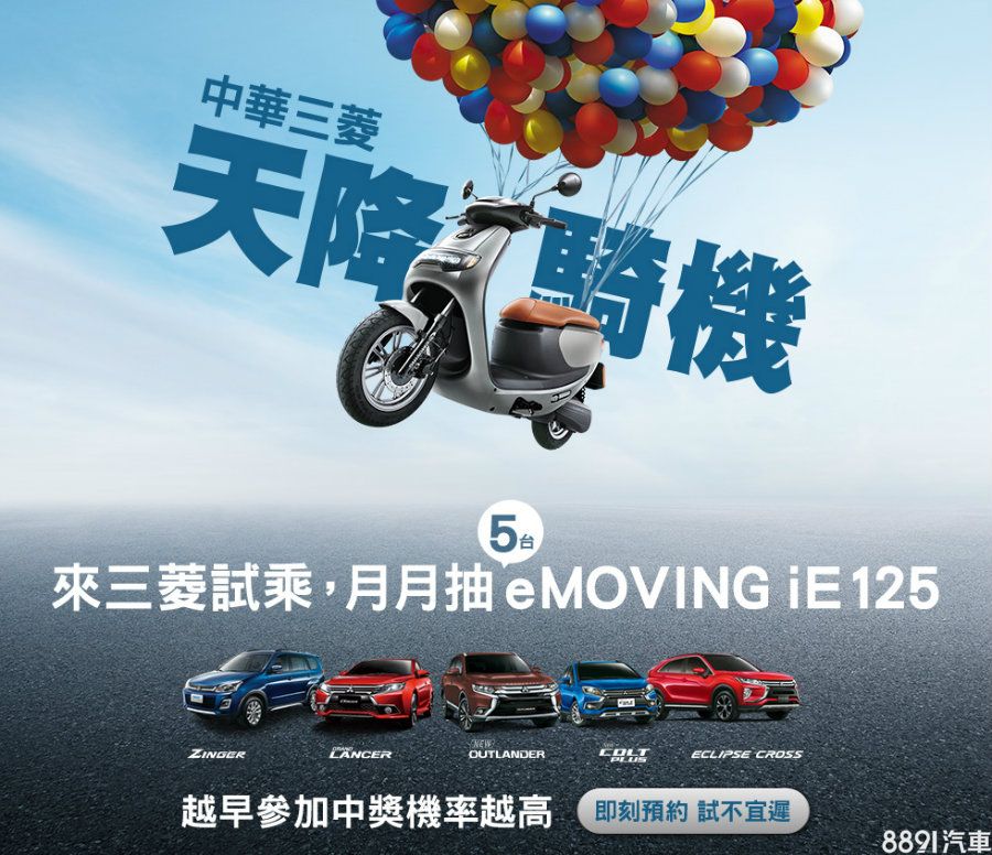 「天降騎機」活動進入最後階段,現在到10/31止,只要至全台中華三菱展示中心試乘Colt Plus、Grand Lancer、Outlander、Zinger、Eclipse Cross、中華菱利A180及A190任一車款,即可領取抽獎卡,憑卡片序號上網登錄,就有機會抽中「eMOVING iE125」壹輛。