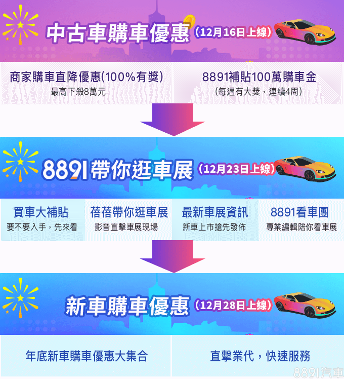 年底購車季 8891再送百萬購車金! 作者:編輯組 2019-12-06 2.6萬 溫馨提示:文字共117個字,3張圖,閱讀約需要1分鐘 繼8月週年慶送出百萬好車之後,8891再次大手筆送百萬購車金,為年底打算買車的您送上福利!買車,先上8891! 8891購車節 購車100%優惠、再贏100萬現金 一大波優惠活動陸續來襲~ 買中古車,最高可優惠25萬,敬請關注! 若您是中古車商家,想要加入8891購車節活動,>>請點我<< 1 8891汽車【車友交流群】熱情招募中! 想要加入8891車友大家庭嗎?這裡有專業的小編與熱情的車友們為你解答買車,用車,養車甚至是修車的疑問!討論每日趣聞,分享個人經驗,想以車會友,現在就加入! 1 上一篇 下一篇 請選擇您覺得沒幫助的原因 您的意見對我們和其他買家都很重要唷 沒有我想看的 像廣告文 比較不夠詳盡 比較不夠全面 內容與事實不符 文章內容不具參考性 其他 確定 取消 資訊 1970-01-01 【詳情】 1970-01-01 【詳情】 1970-01-01 【詳情】 1970-01-01 【詳情】 1970-01-01 【詳情】 1970-01-01 【詳情】 1970-01-01 【詳情】 1970-01-01 【詳情】 1970-01-01 【詳情】 1970-01-01 【詳情】