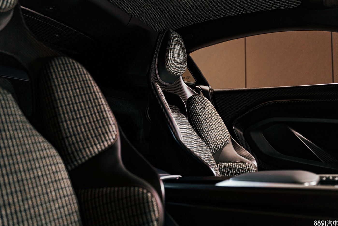 座椅則配備兩張碳纖維跑車椅,除了進一步達到輕量化目標,也為車內的競技感加點分,椅面上的羊毛格紋質料,則致敬了1959年利曼冠軍賽車DBR1的座椅鋪料。