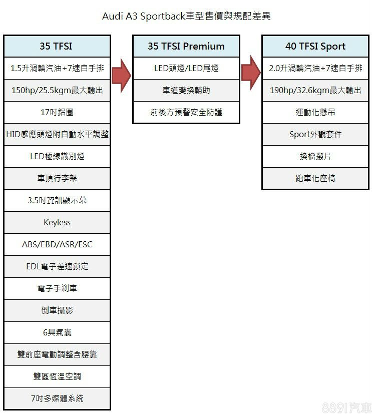 動力部分,A3 Sportback提供兩款動力,35 TFSI搭載1.5升直列四缸渦輪增壓汽油引擎,最大輸出150hp/25.5kgm,0~100km/h可於8.2秒完成;40 TFSI配置2.0升直列四缸渦輪增壓汽油引擎,可產生190hp/32.6kgm之最大動力,0~100km/h為6.8秒。A3 Sedan則提供35 TFSI單一動力規格,以上均搭配7速S-tronic自手排變速箱。
