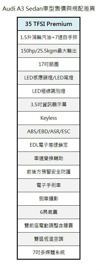 安全輔助項目方面,全車系標配ABS、EBD、ASR、ESC、EDL電子式差速鎖定等,35 TFSI Premium以上車型增加Audi side assist車道變換輔助系統、Audi cross traffic assist rear後方預警式安全防護系統,並整合後方橫向車流警示功能、Audi pre sense front前方預警式安全防護系統、及Audi pre sense basic預警式安全防護系統。
