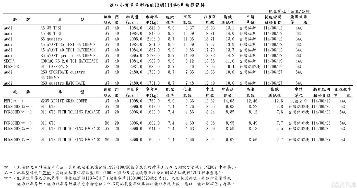 燃油動力方面,大多是已上市車款,如Audi新世代A5、小改款A3及Porsche 911、Kodiaq RS公布能源署油耗數據。其中A5統一搭載2.0升四缸渦輪,油耗依車型落在13.1~14.0km/L,性能擔當S5雖配置3.0升V6渦輪,但有48V輕油電系統協力,旅行車版反倒交出車系最佳14.2km/L數據,頗讓人驚喜。
