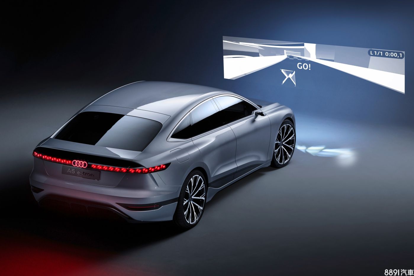 A6 e-tron Concept在頭尾設計皆沿用當代Audi的設計特色,頭尾燈組皆以細長造型呈現,新Matrix矩陣式頭LED燈頭燈宣稱具投影功能,可於前方投映行車資訊,尾燈則比照小改款Q5導入OLED技術,讓燈組能有豐富的光型變化。