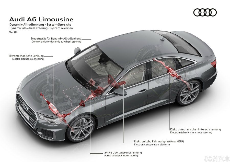 在操控部分,Audi強調新款A6擁有新一代的電子轉向機構,依速度變化,轉向齒比可在9.5~16.5之間調整,同時也加入後輪轉向系統,與所有四輪轉向設定一樣,低速時,後輪轉向角度與前輪相反,高速時便為同向,而在避震器設計上,除了傳統油氣減震筒、可調電子阻尼之外,最高規採用氣壓機構。