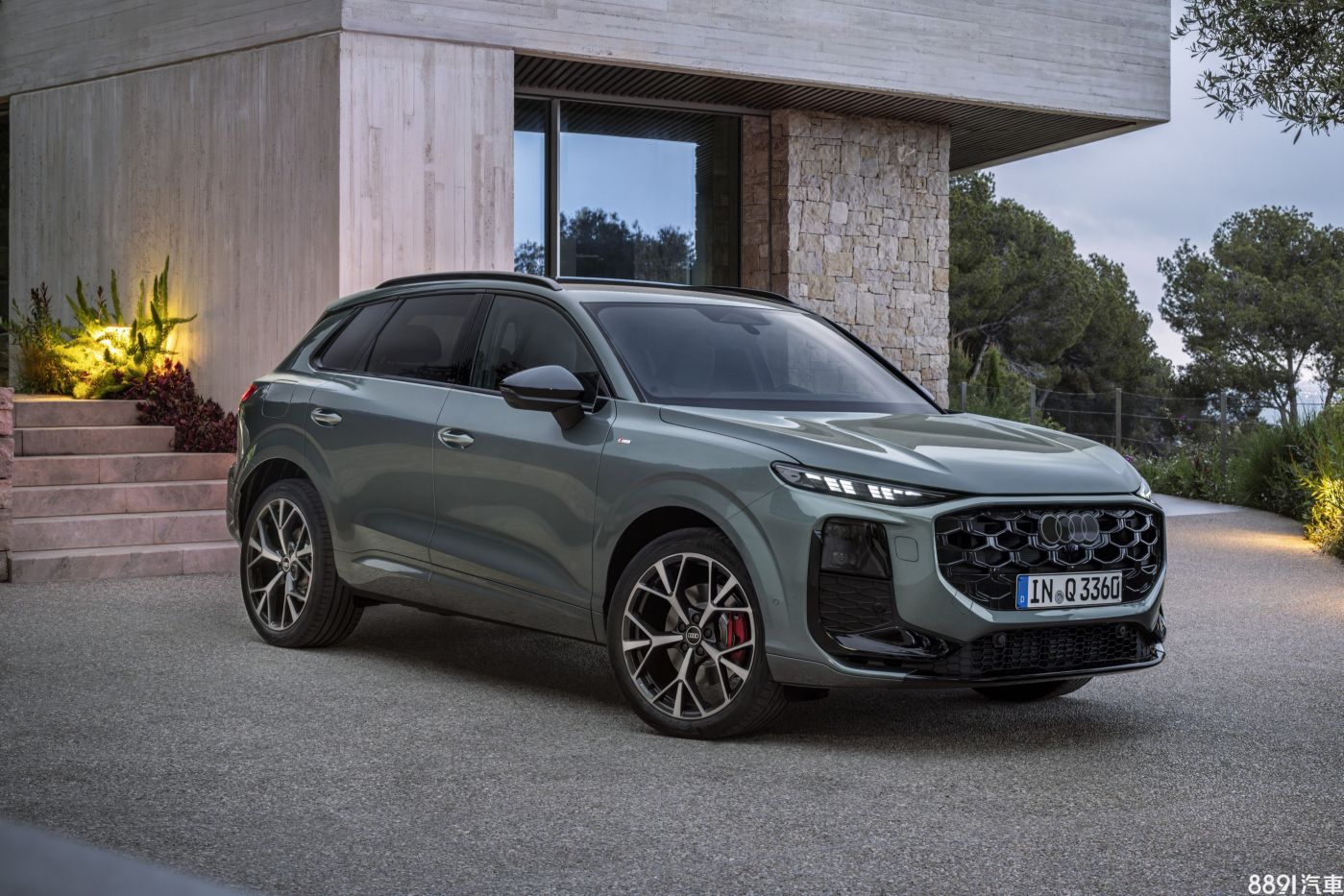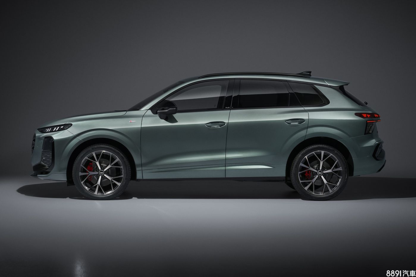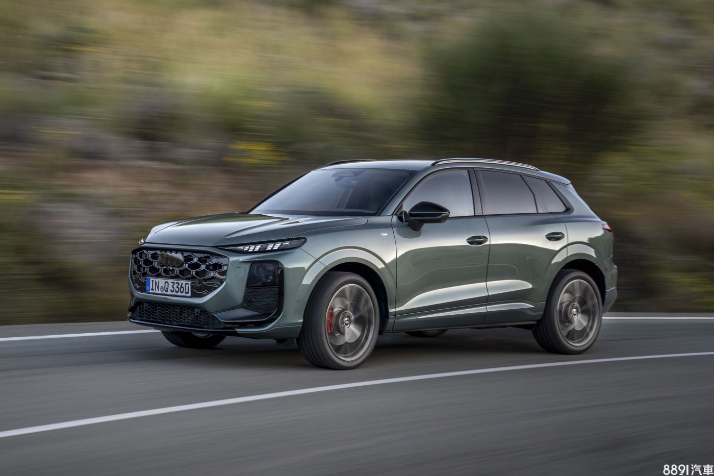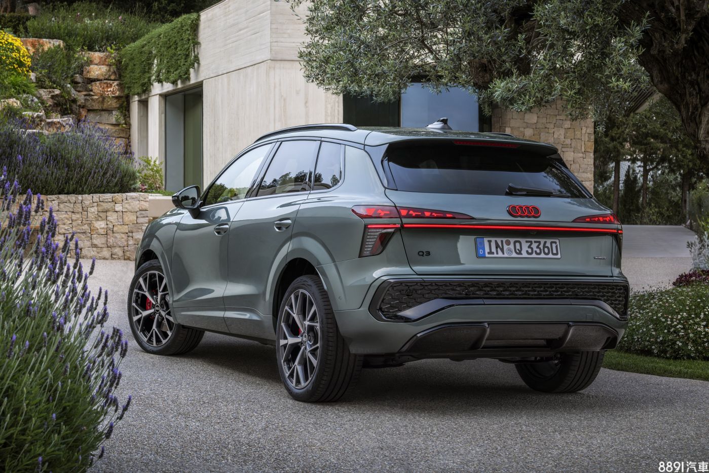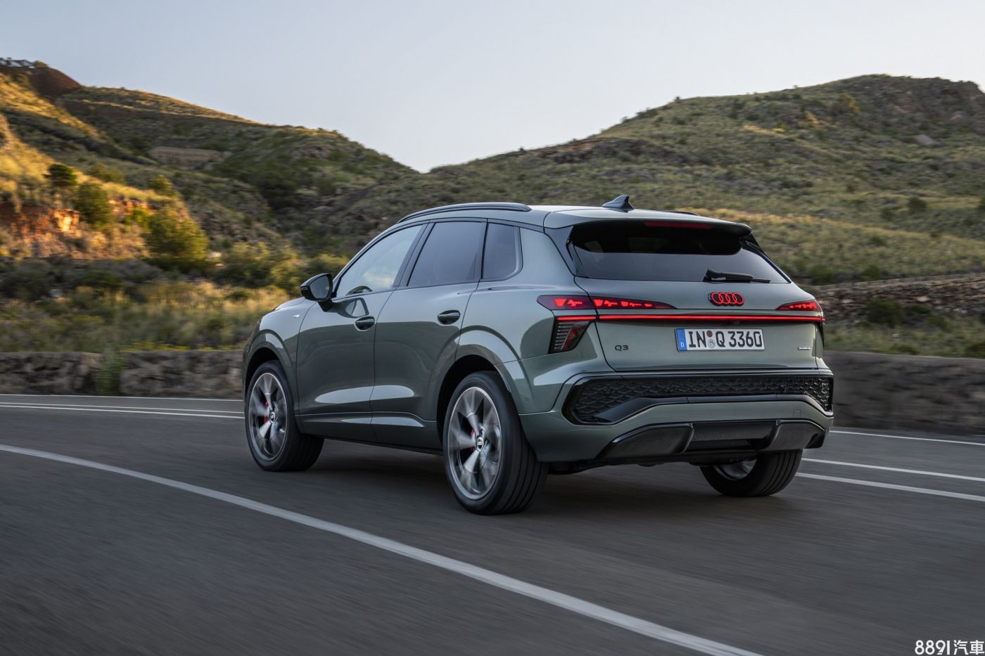 車側望去,新一代Q3有著高聳的腰線、車門下緣深刻折線,搭配更加傾斜的D柱設計,視覺上更顯動感。外觀車色共有11種可選,包含新增的鼠尾草綠(上圖)與馬德拉棕,並視車型等級搭配17~20吋鋁圈。