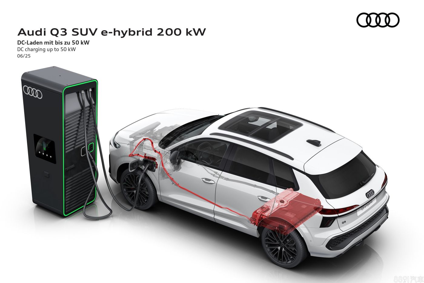 Q3 e-hybrid插電式混和動力,由1.5 TFSI結合電動馬達、25.7kWh電池組,具備272hp/40.8kgm最大綜效輸出,依WLTP測試標準,純電續航里程可達119km,採用50kW直流電快充,可在半小時內將電量自10%回補至80%。