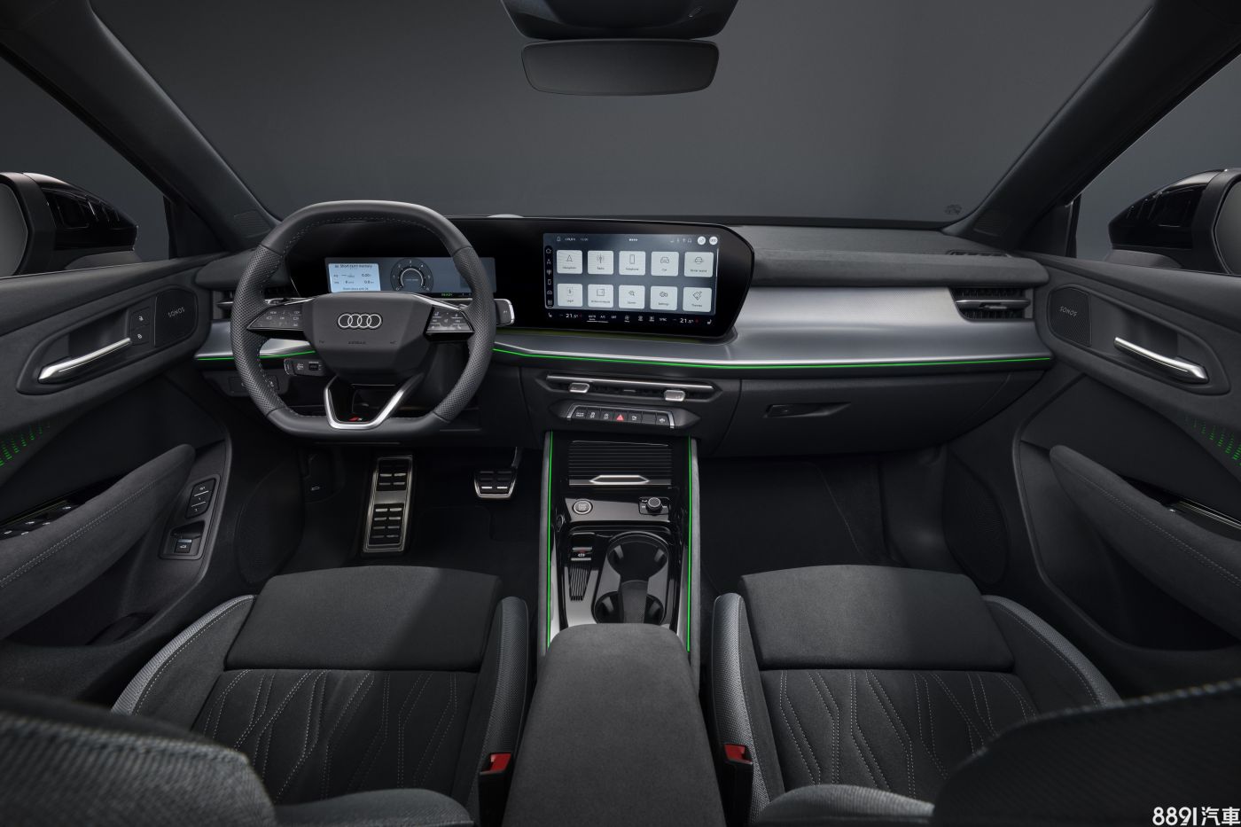 車內也如新世代A5、A6換上家族化風格,採用11.9吋數位儀錶+12.8吋MMI觸控雙螢幕組成,同時將排檔整合到方向機上,讓車內看起來更加開闊,對於中船的置物空間佈局也有加分。另外,也提供30色氛圍燈套件可選,門板、中控台都有設置LED燈條。