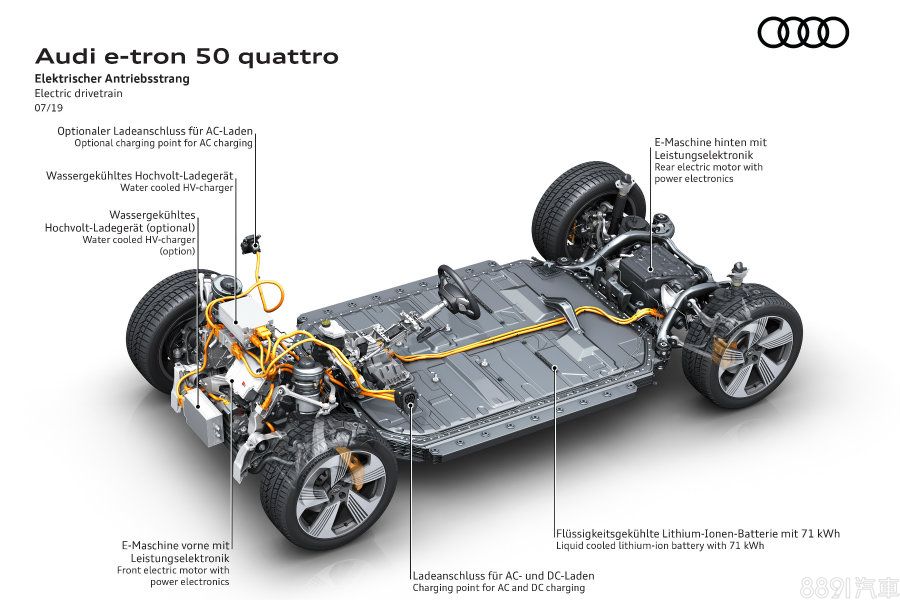 e-tron 50 quattro移植了55 quattro的雙馬達動力配置,但為配合產品定位,最大綜效輸出縮限為308hp/55kgm,降幅達94hp/57.2kgm。也因此,e-tron 50 quattro的0~100km/h加速需要7秒整,相較於頂規款略慢1.3秒。