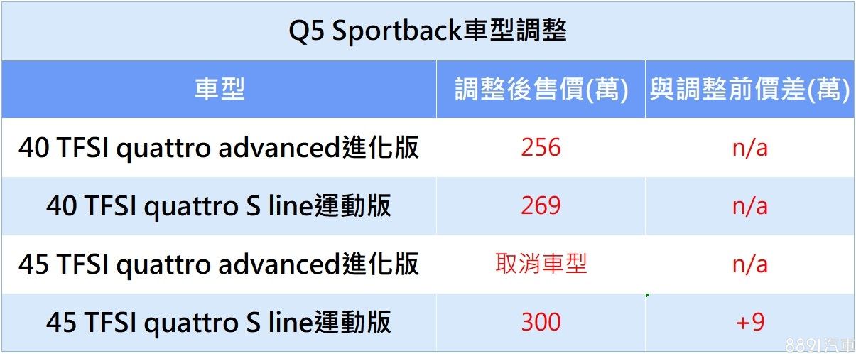 Q5/Q5 Sportback調整動力與價格,原先僅提供45 TFSI quattro單一動力,如今追加40 TFSI quattro讓車系入手價格從256萬下探至225萬。導入車型也經過全面調整,45 TFSI quattro取消多款車型,僅保留45 TFSI quattro S line運動版做為車系頂規。