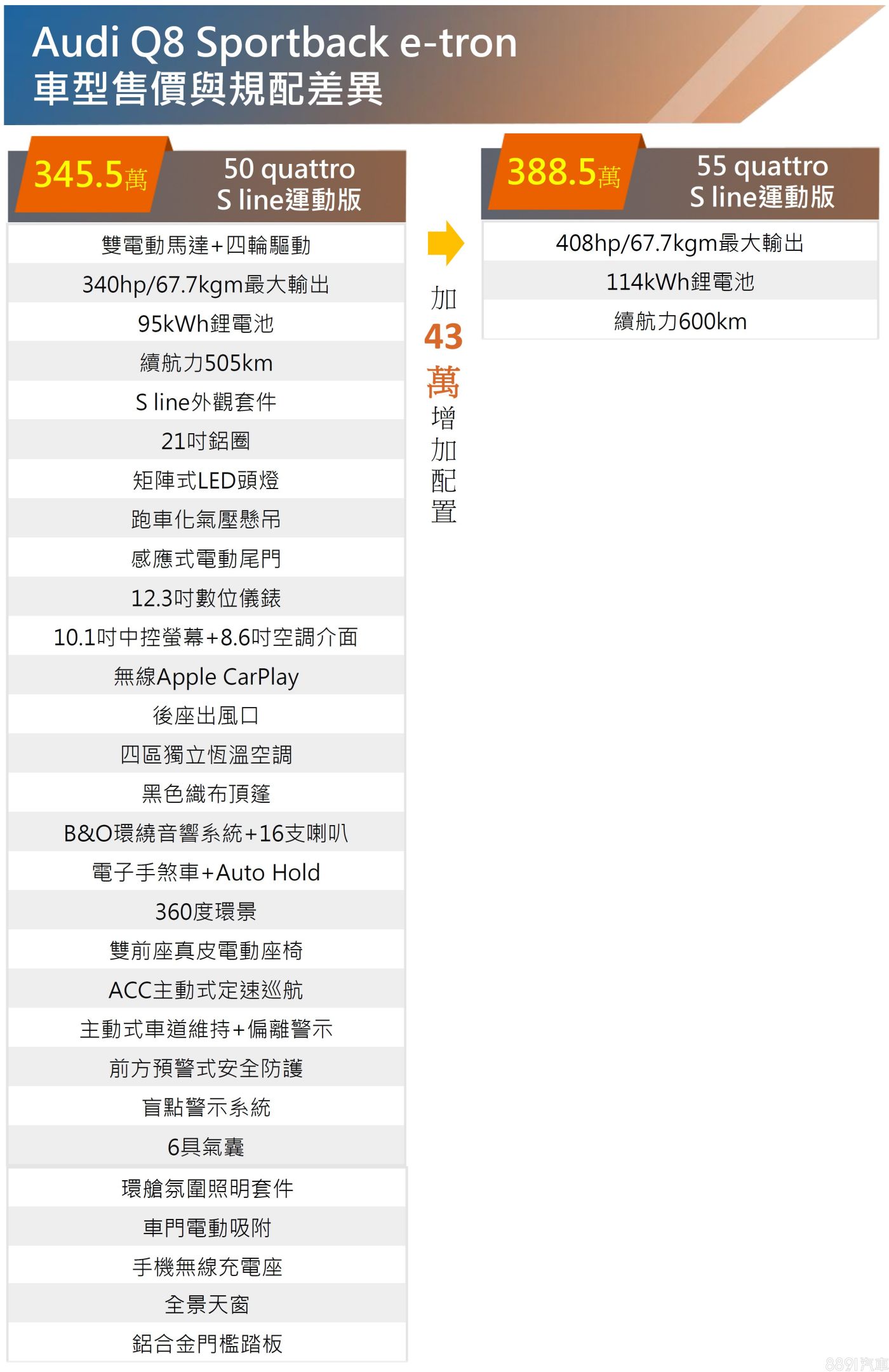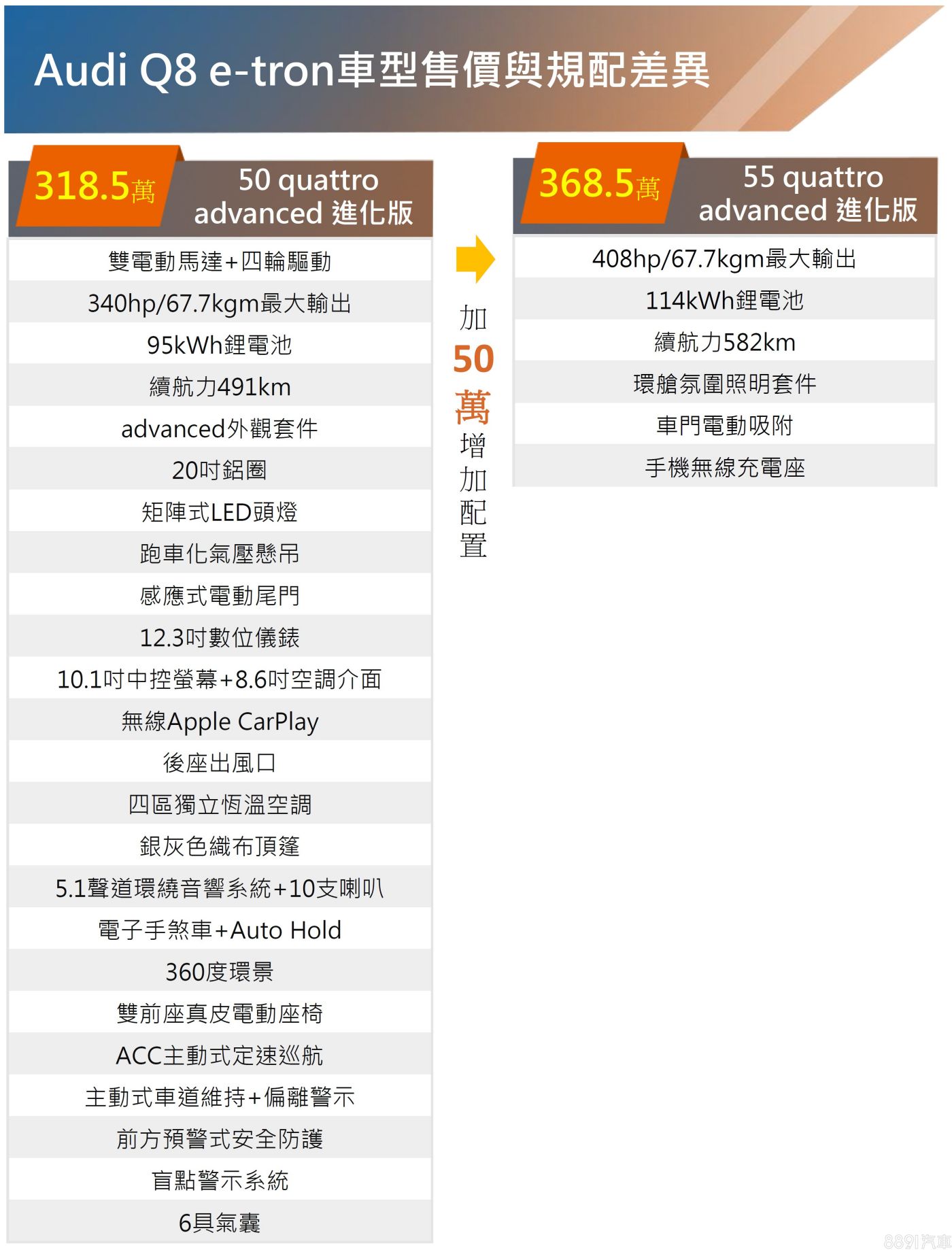e-tron小改款後更名而來的Q8 e-tron,國內提供標準款和Sportback跑旅車型,並具備50 quattro 、55 quattro兩種動力選擇,正式售價標準款雙車型分別為318.5萬、368.5萬,Sportback雙車型則是345.5萬及388.5萬。