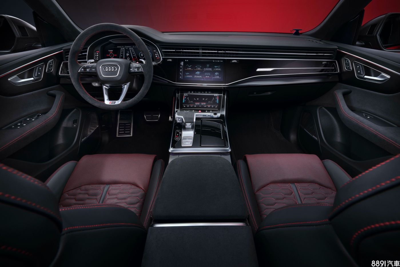 座艙維持「三螢幕」的布局:12.3吋數位儀錶+10.1觸控式多媒體系統+8.6吋空調介面,儀錶會依轉速逐漸攀升,從綠色變為黃色最終變為紅色,強化操駕時的感官體驗。除了搭載RS徽飾的專屬方向盤、碳纖維飾板、金屬踏板等,RS Q8 Performance施以紅色車縫線,增添性能氛圍。