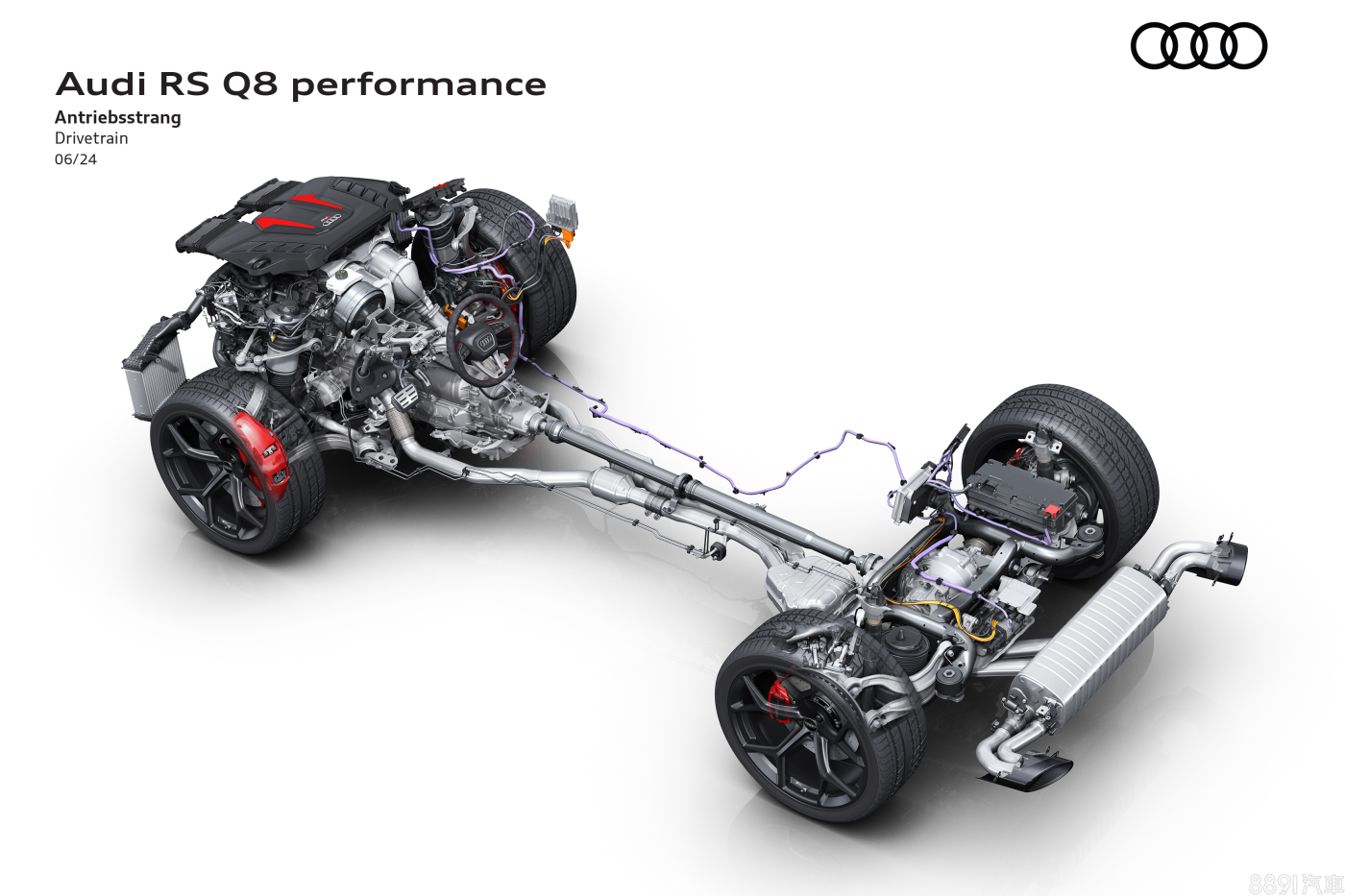 小改款RS Q8依舊搭載加入48V輕油電技術的4.0升V8雙渦輪汽油引擎,最大輸出與先前持平,為600hp/81.6kgm,不過這回推出的Performance版本,將出力再升級至640hp/86.7kgm,搭配8速Tiptronic手自排變速箱與quattro四驅系統,0~100km/h分別可於3.8、3.6秒完成,後者更是在紐柏林北環賽道,以7分36.698秒的成績,打敗同集團的Porsche Cayenne Turbo GT,創造了新的單圈紀錄。