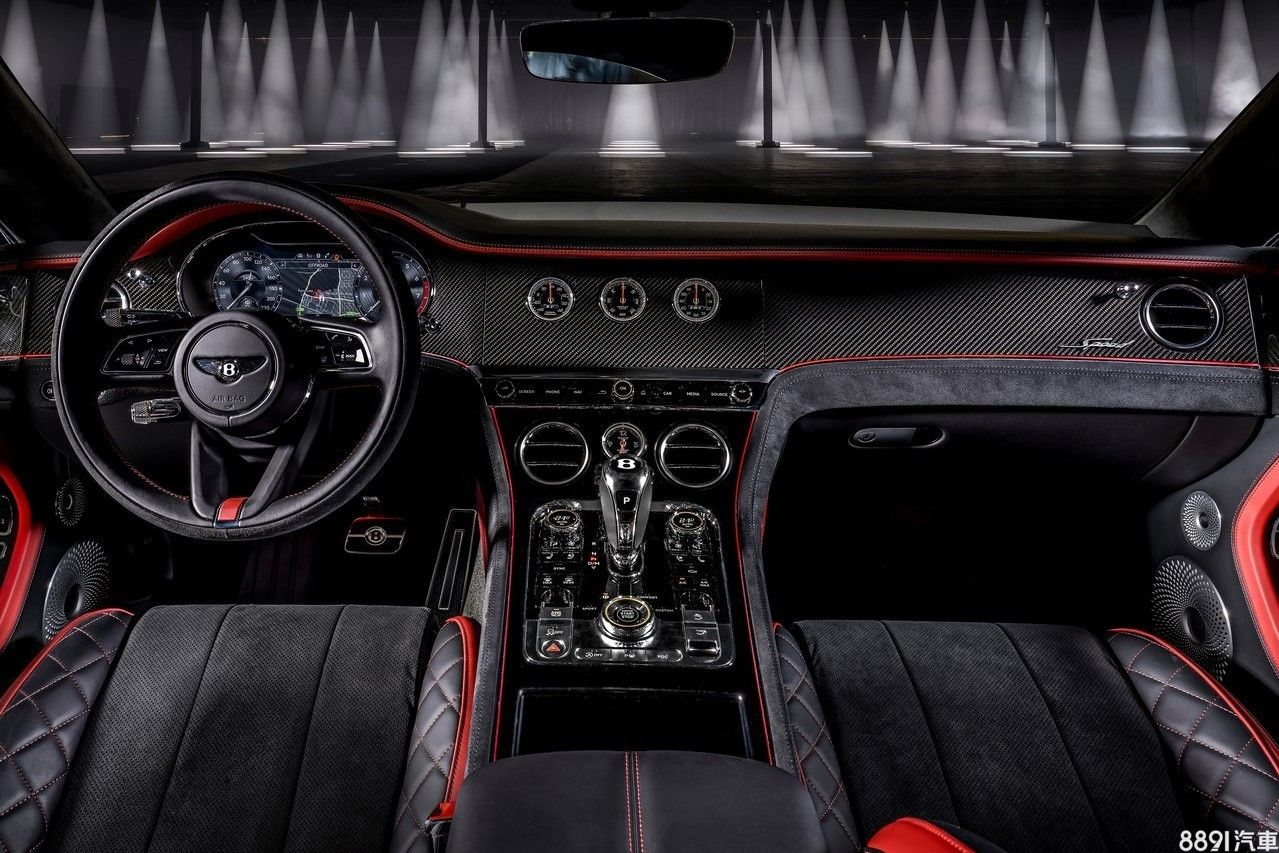 車內維持Continental GT車系現有格局,Speed版透過雙色皮革、Alcantara麂皮,搭配鋁質飾板或碳纖維飾板提升車內質感,車內亦可看到專屬車內銘牌、Speed門檻與跑車化踏板。