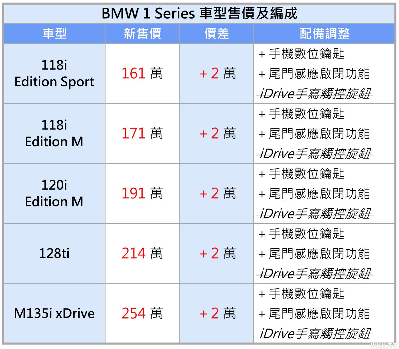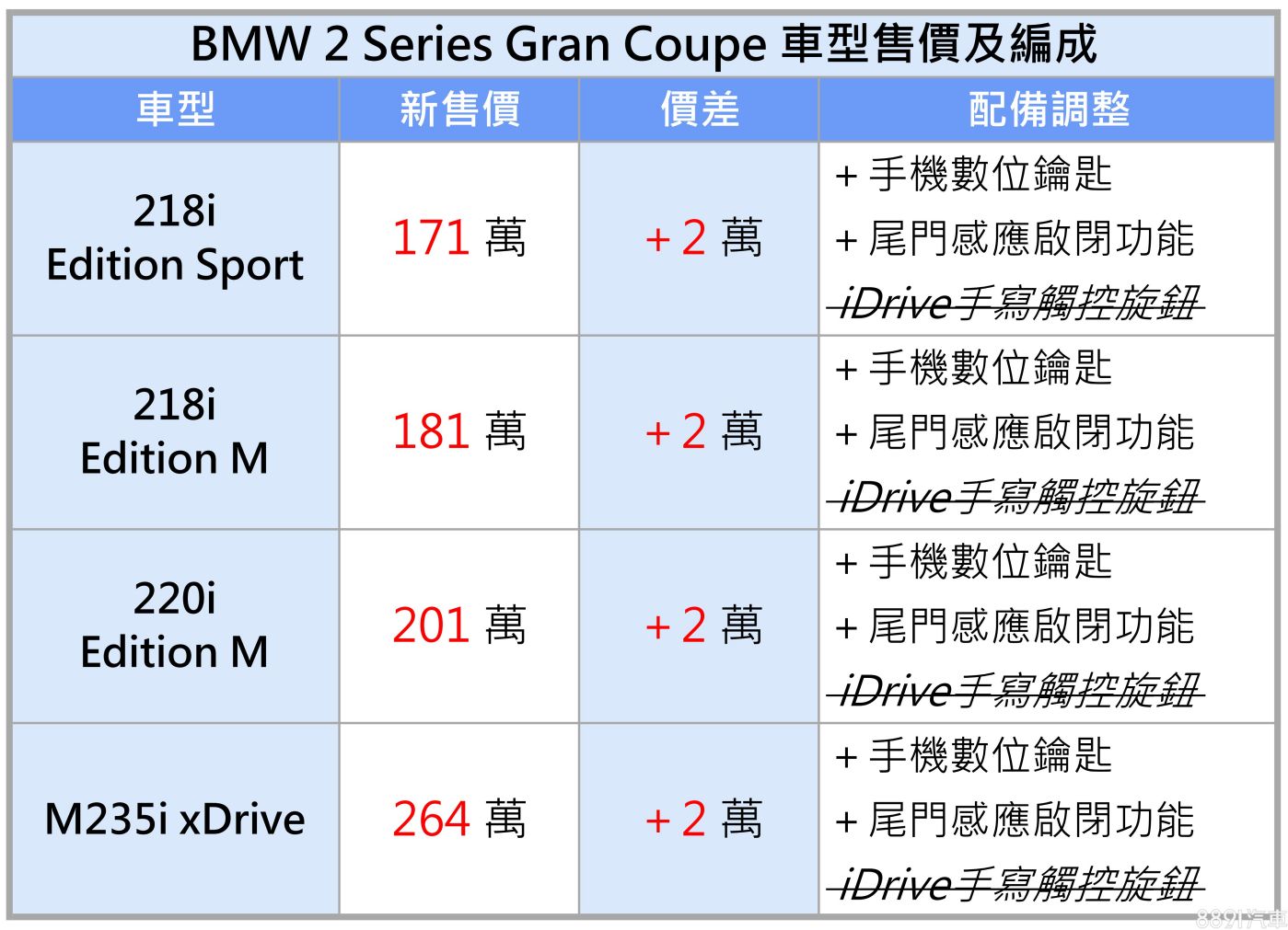 BMW稍早針對麾下1系列及2系列Gran Coupe兩車系列,更新國內車型售價及配備。其中,價格部分,兩車系不分車型全面調漲2萬元,意即1系列價格調整為161萬起,2系列Gran Coupe售價則自171萬起跳。