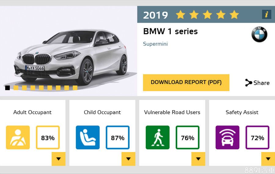 在1系列方面,雖然整體評分並不算低,但報告也特別表示,若遭遇「正面全寬撞擊」時,不僅後排乘客的胸部存有較高致傷風險,「後方追撞」也容易對前座人員的頸部造成傷害,為此,受限於低速防撞(AEB City)的評分標準,NCAP整體評分僅給予83%,透露防護層面仍有進步空間。