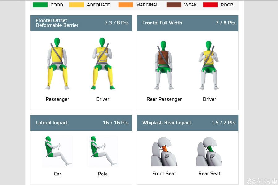 針對6~10歲的「兒童防護」,後座配有2組ISOFIX固定裝置,加上安裝便利,遭遇「正、側面撞擊」均不致脫落等優點,賦予高分87%可說實至名歸。