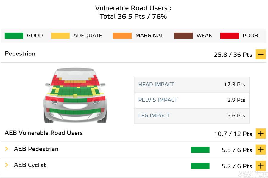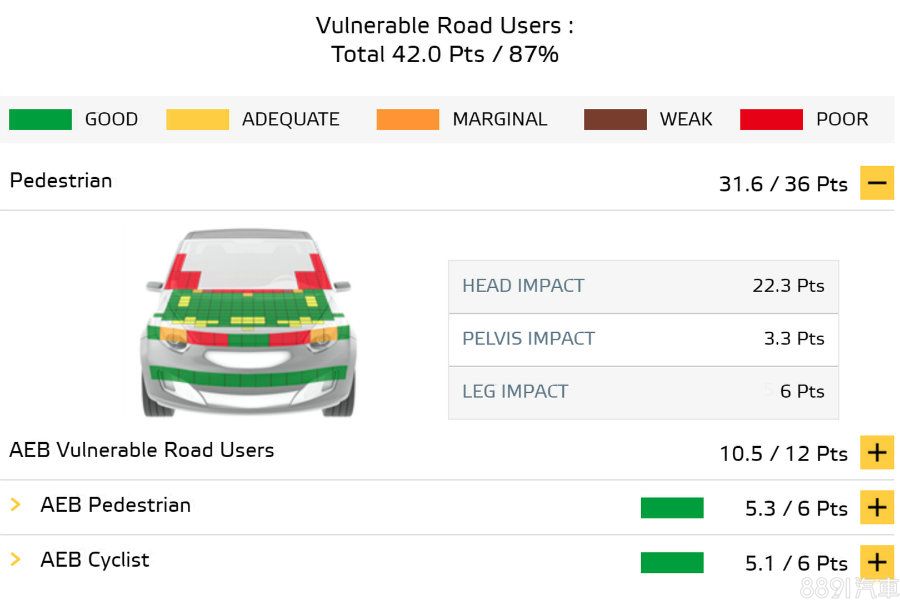 「弱勢道路使用者保護」仰賴於AEB自動緊急煞車(含行人、自行車偵測)的優異防撞表現,加上車頭結構設計良好,除兩側A柱與引擎蓋前緣可能造成較高的受傷風險,若發生碰撞,其餘區域均能避免嚴重撞擊傷害。