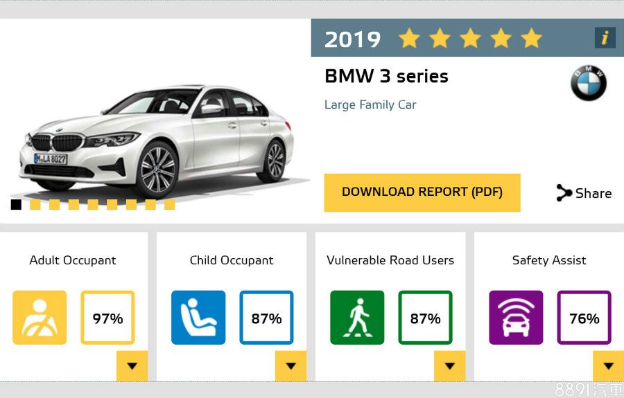 相較於新款1系列,3系列不論在「正面全寬撞擊、小偏位撞擊、側撞以及後方追撞」等測試均有良好表現,完整確保車室人員的防護安全,為此NCAP評分給予97%,相當於滿分級別。