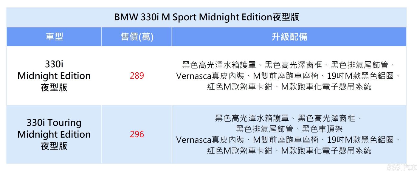 330i/330i Touring Midnight Edition夜型版仍搭載2.0升四缸渦輪引擎,可爆發258hp/40.8kgm最大輸出,匹配8速手自排變速箱,房車版0~100km/h加速僅需5.8秒、旅行車也可在6秒內完成。
