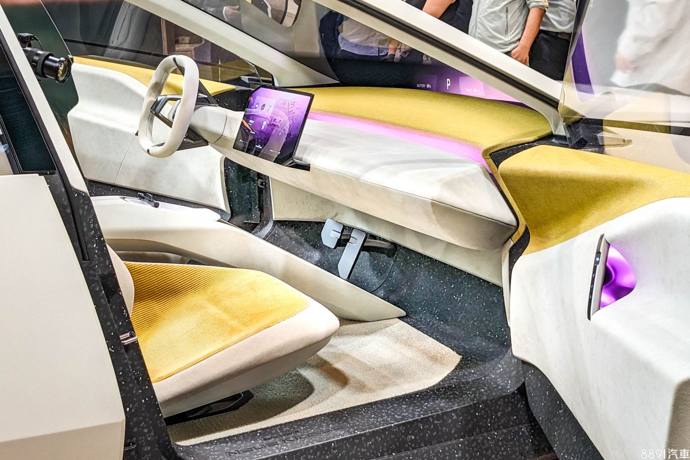 概念車為四門四座設計,內裝採雙色對比混搭,淺色系帶來明亮感之餘,搭配大面積車窗也讓車室感覺較為開闊。座椅均為絨布包覆,未使用真皮材質,原廠指出是為了實現環境永續和低碳排製程的願景而為之。