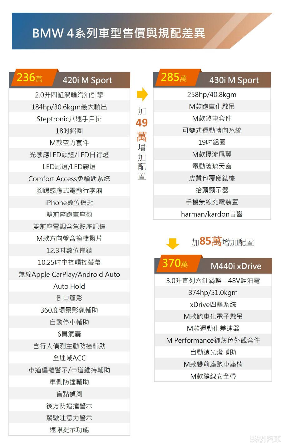 國內導入的新4系列設有420i M Sport、430i M Sport以及M440i xDrive三種車型,正式售價依序為236萬、285萬及370萬,與預售價持平。據了解目前訂單已累積至150張,首批配額120輛已完售,420i與430i各佔4成。