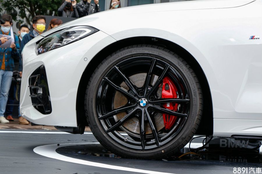 430i M Sport則升等19吋雙肋五輻鋁圈,不規則的切削樣式增添動感,搭配輪胎規格為前225/45R19、後255/35R19,並升級車高降低10mm的M款跑車化懸吊、配有藍色卡鉗的M款煞車套件,展示車另加選1.7萬紅色卡鉗及亮黑色鋁圈。