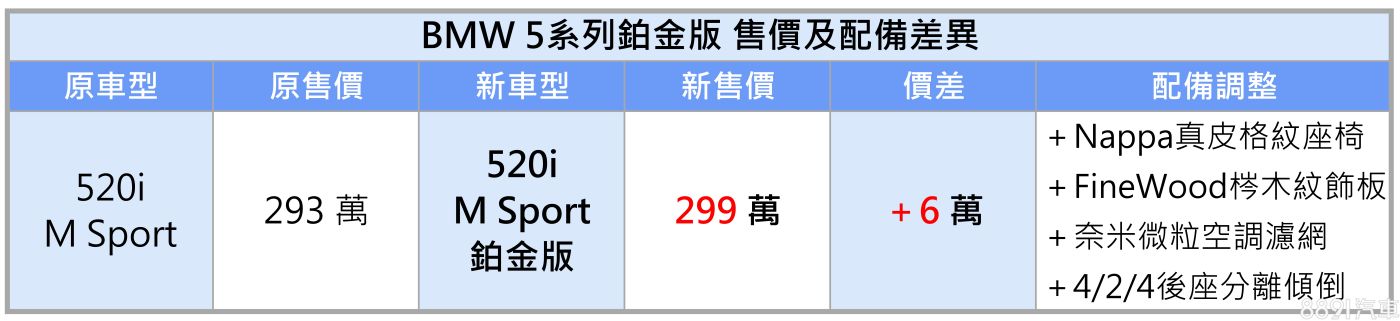 對於現行款BMW 5系列有興趣的消費者,請把握最後機會!眼見大改款發表在即,原廠在國內以「鉑金版」作為最後一批現行款上市,車系也隨版本縮編為「520i M Sport鉑金版」單一車型,售價299萬,比起原款「520i M Sport」小漲6萬元。
