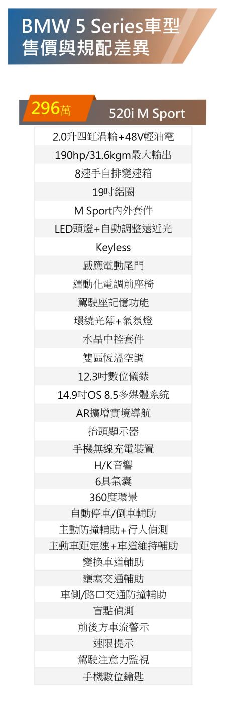繼11月底先以純電i5打頭陣後,BMW公布汽油版本中的520i動力車型,標配M Sport套件,售價296萬元,重點規配如附表,預計明年還會追加530i。