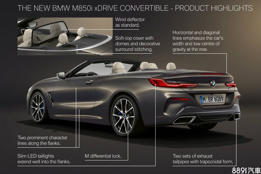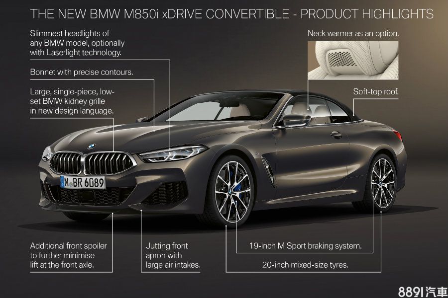 與早一步問世的新Z4相同,8系列Convertible雖標配黑色軟篷,但亦提供煤灰銀的篷色供選配。至於可安置於後牌空間的迴風網,為M850i之標配項目之一,不過前排座椅頭枕處的頸部暖氣則仍以選配項目提供。