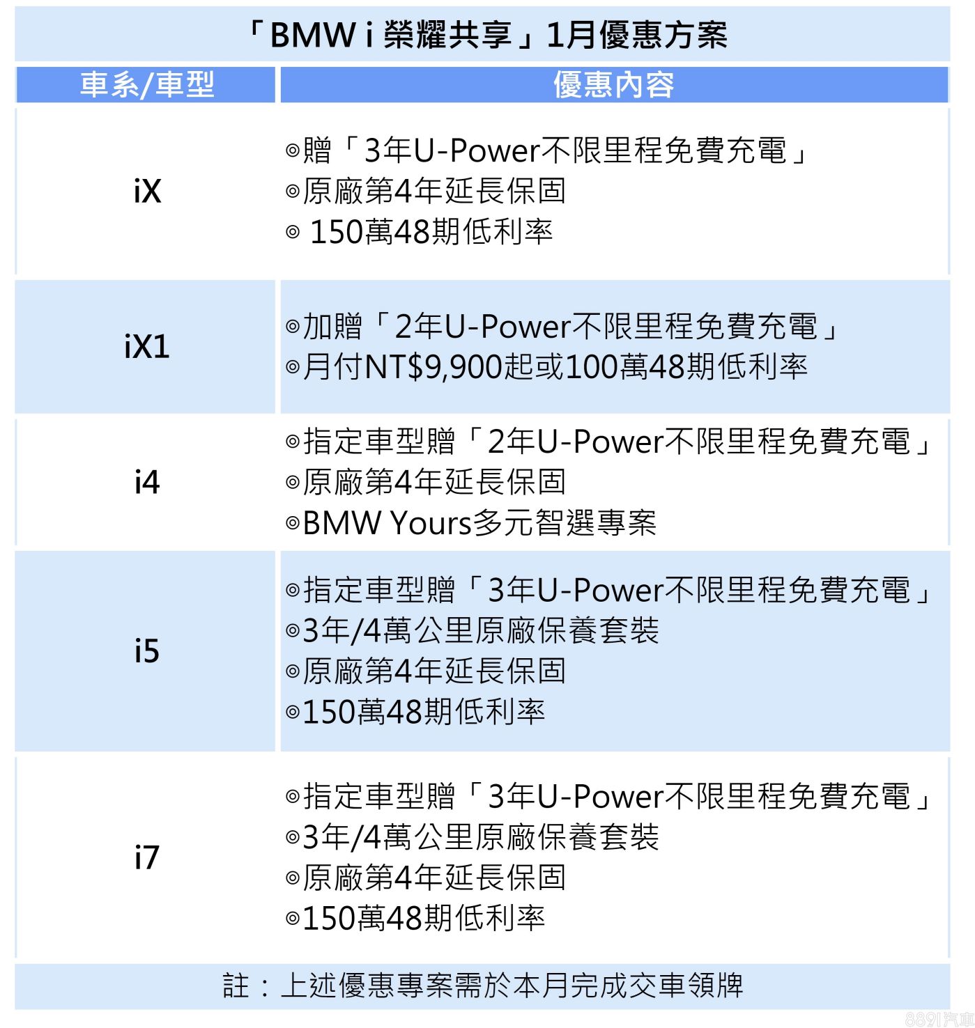 「BMW i榮耀共享」專案針對iX、iX1、i4、i5、i7推出不同優惠內容,本月完成交車領牌,指定車型除了可享高額低利率外,再加贈最高3年U-Power不限里程免費充電,部分車型再享原廠保養套餐及第4年延長保固。