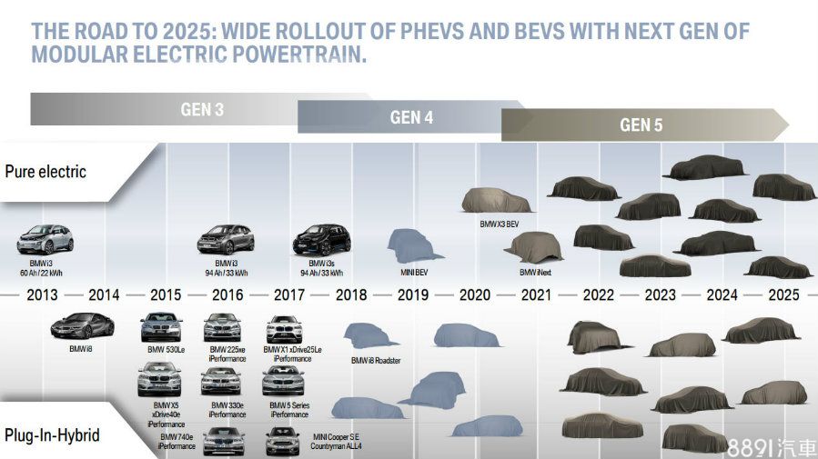 計畫中的首批PHEV車型將以日前甫於洛杉磯車展發表的i8 Roadster作為領頭羊,並可能由至少一款的跨界車型尾隨其後。BMW品牌的純電部分則會在2020年由純電X3開出第一槍,並於稍後接著推出外傳已久的iNext電動車。平價路線將由MINI做為主力,並至少會有一款的純電MINI在兩年內問世。