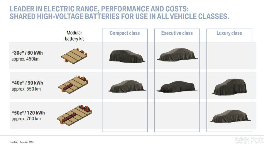 未來原廠將針對車型級距採用不同容量的模組化電池。其中,將用於中大型級距(5系列及其延伸)以下的60kWh及90kWh模組化電池組將依序綴名為30e及40e,並分別提供約450km、550km的純電續航力。大型級距(7系列及其延伸)以上者,則在40e車型外另導入120kWh電池組,後者將綴名為50e並具備近700km的續航力。