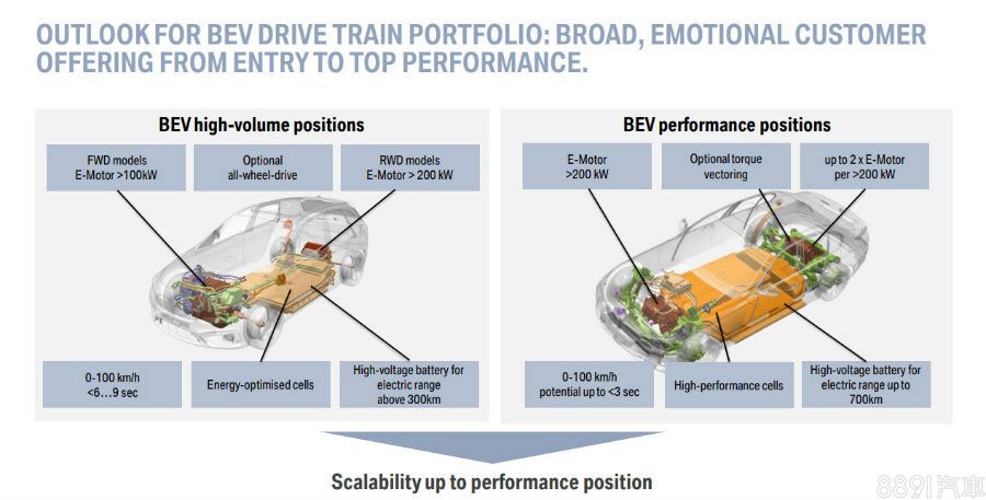 除了電池電量之差別,原廠亦針對車輛訴求推「高運量」及「性能」兩種不同定位。前者可針對車型採前驅、後驅或四驅配置,電池性能偏重高效經濟性,但由於電池組較小,純電續航力僅300km;後者最多可配置兩具馬達,並於部分車型提供扭力分配機制,運動取向的高性能電池不僅具備最高700km的續航力,更可在三秒內自靜止加速至100km/h,然而較大的電池也將影響到車內空間表現。