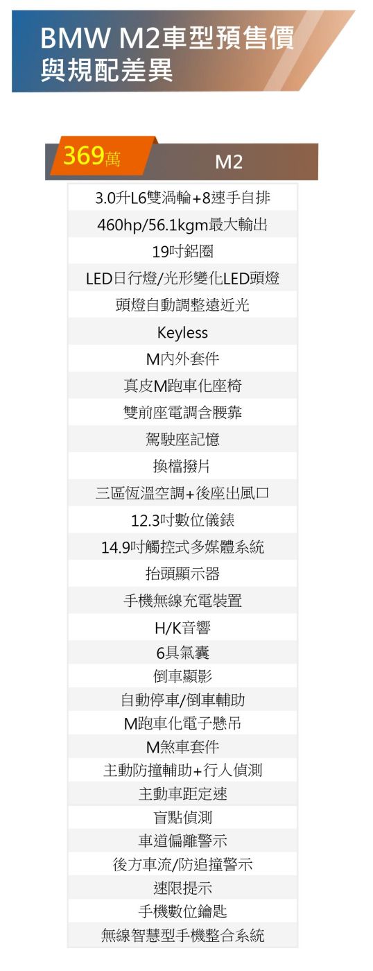 新世代M2初期在國內提供單一車型,搭載的是M3/M4上、代號為S58的3.0升直列六缸雙渦輪汽油引擎,即便調降出力以符合產品的定位,但最大出力460hp/56.1kgm,還是比起前代頂規M2 CS,還多出10hp最大馬力,若相比前代基本款,最大馬力漲幅更達90hp!