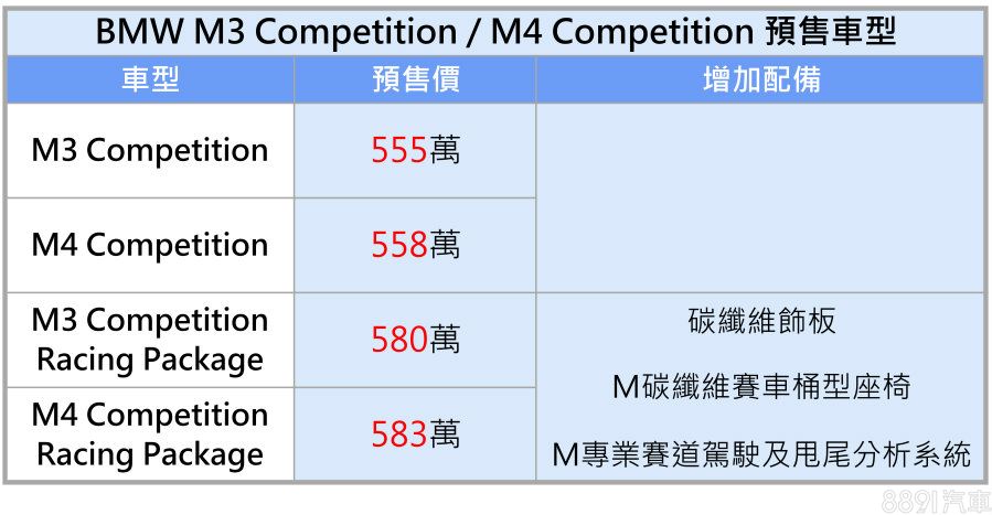 首批僅規劃M3 Competition及M4 Competition兩版本,預售價分別為555萬及558萬,如探求更運動化的風格,兩車均可加價25萬升級「Racing Package賽車套件」,套件包含「碳纖維桶型賽車椅」、「碳纖維飾板」及「賽道駕駛及甩尾分析系統」等三項配備。