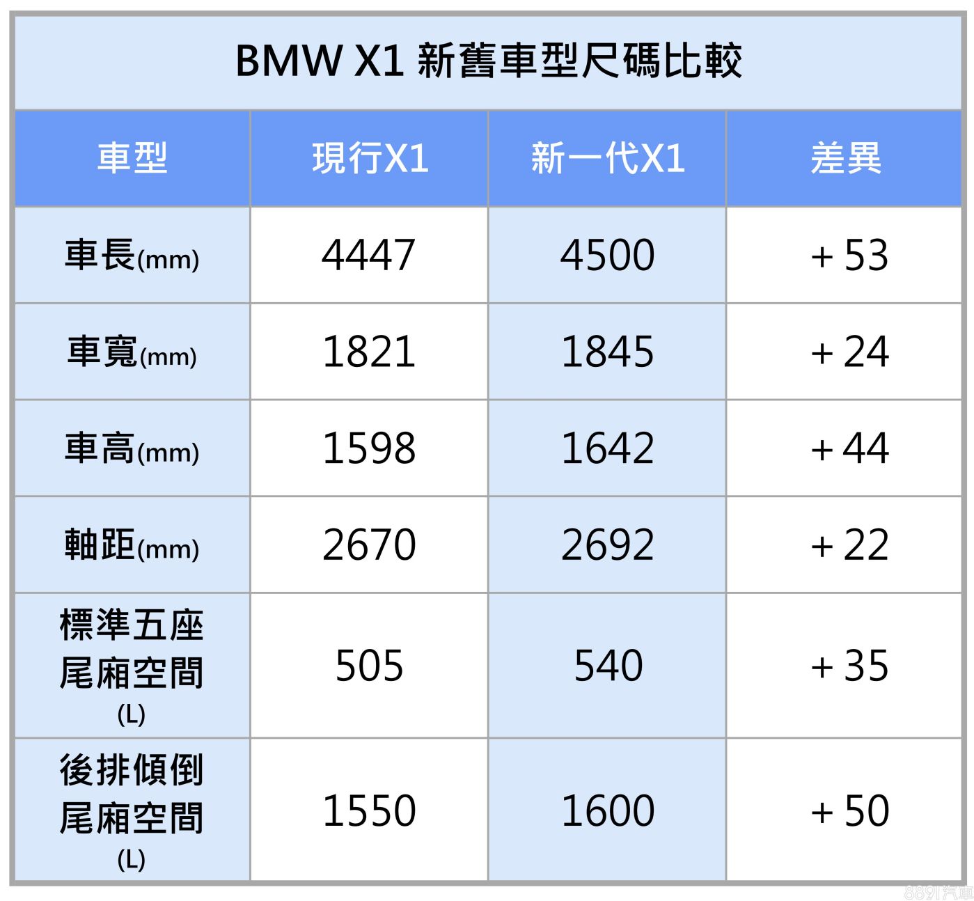 新X1各尺碼皆獲放大,官方並宣稱前、後輪距在加大31mm後,有助提升行車穩定性。此外,原廠想藉輕量化來提升能源效率,表示除了採用鋁合金引擎蓋,以熱沖壓鋼材和鋁合金製成的座艙結構,亦兼顧了減重和車身剛性的需求。