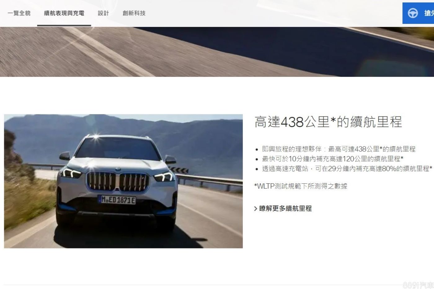 按照官網公布的資訊,iX1採用WLTP測試標準,擁有438km的純電續航力,使用BMW i直流高速充電站,可於10分鐘內補充120km的行駛里程,透過高速充電站,可在29分鐘內補充高達80%續航里程。