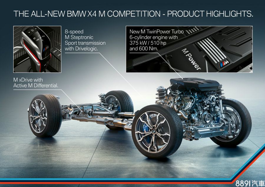 X3 M及X4 M均搭載新的3.0升直列六缸雙渦輪增壓引擎,此具引擎經過原廠針對曲軸、汽缸蓋、渦輪增壓器、供油和冷卻系統進行強化,並提高直噴壓力,一般版擁有480hp/61.2kgm之最大輸出,Competition版本出力達510hp/61.2kgm。