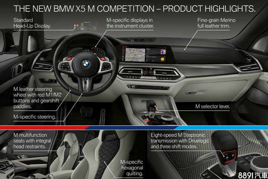車室以配置碳纖維飾板、M款方向盤與排檔桿、專屬門檻飾板、擁有專屬顯示的數位儀錶,以及更講究車室用料等細節呈現,M款跑車化運動座椅頭枕上的M字樣,更可讓人一眼辨識其身分。